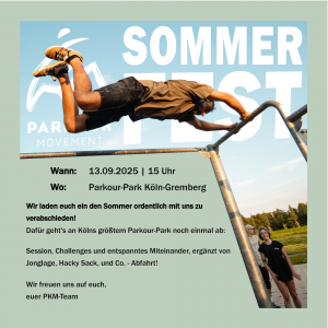 PKM Sommerfest 📅 13.09.2025 | 🕛 Kids: 12 Uhr | 🕛 Erwachsene: 15 Uhr📍 Parkour-Park Gremberg Wir laden euch herzlich ein, das Ende der Sommersaison gemeinsam zu feiern! Dazu treffen...