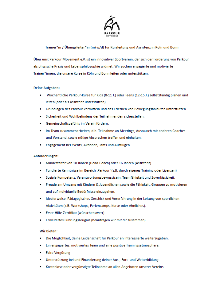 Interesse? Dann melde dich gern mit einem kurzen Steckbrief zu dir via info@parkour-movement.com mit dem Betreff „TRAINERSUCHE“.