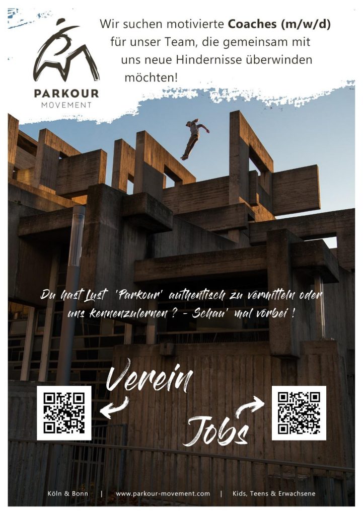 Wir suchen nach Unterstützung im Team der Trainer*innen für die Kurse bei Parkour Movement e.V. in Köln und Bonn. Egal ob du schon mit Lizenzen qualifiziert bist, Erfahrung als Coach hast oder noch ganz am Anfang stehst, aber Lust hast, deine Leidenschaft für Parkour authentisch zu vermitteln: meld dich gern bei uns!